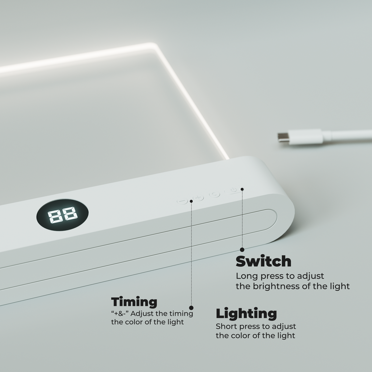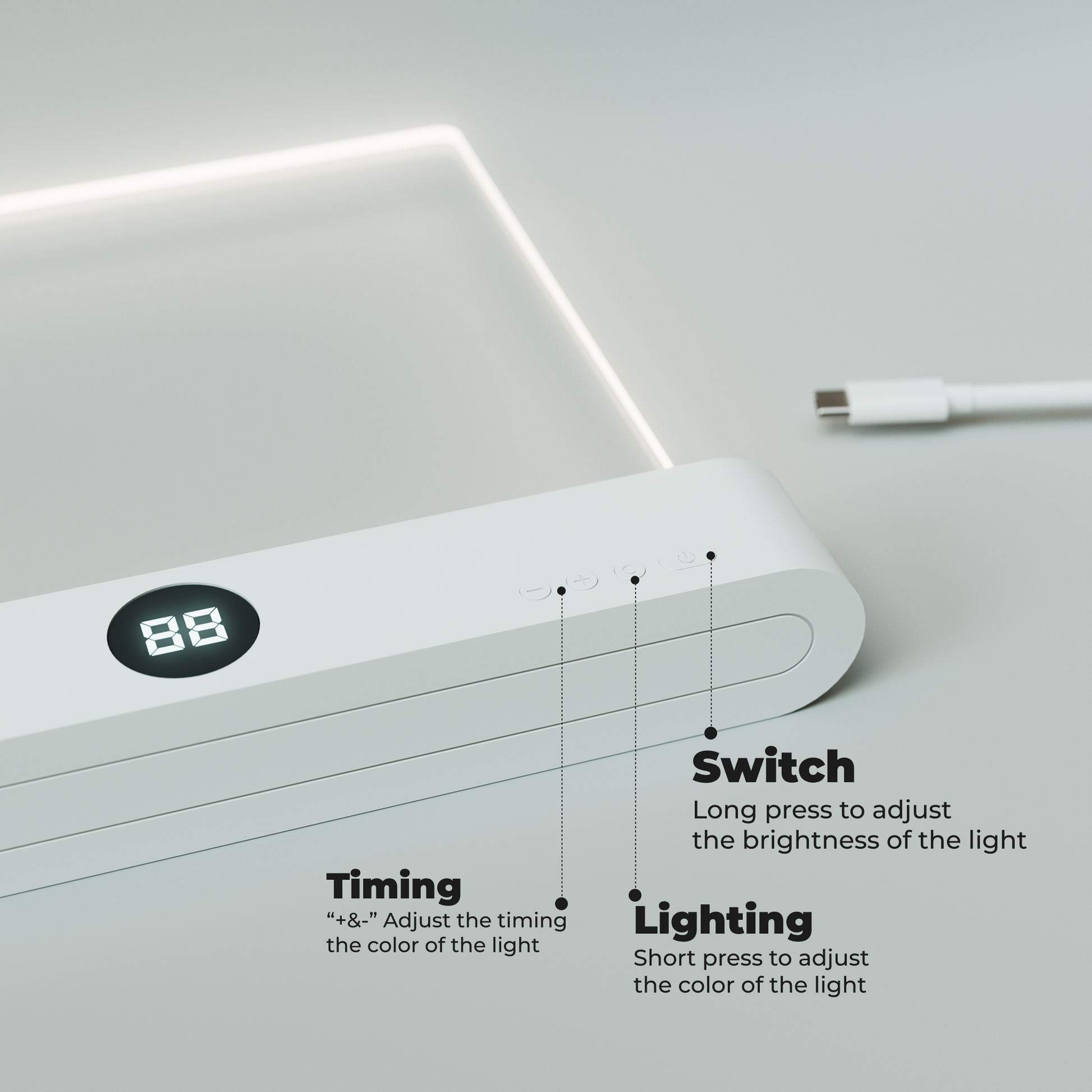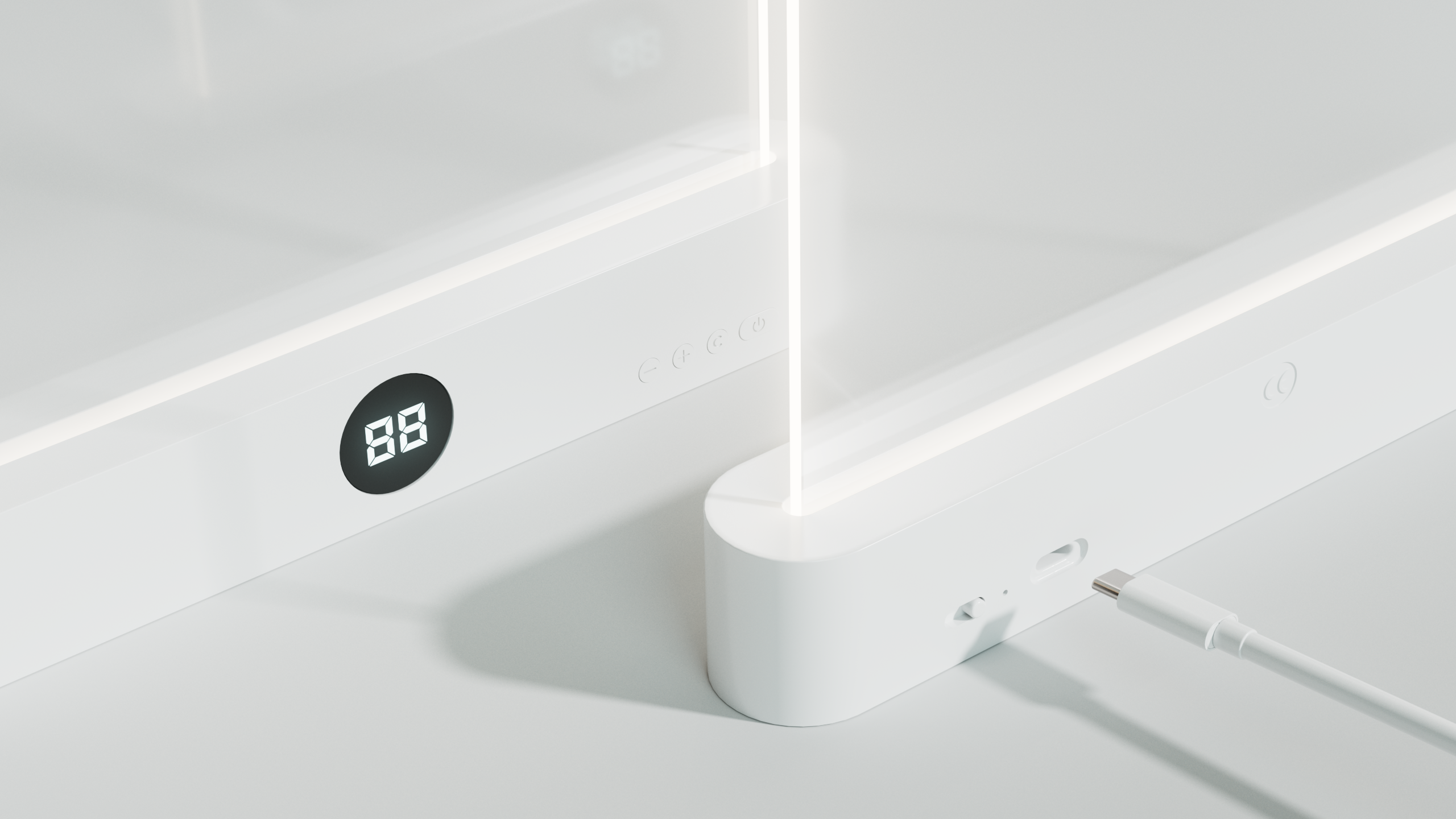 Connect the lamp to a USB-C port and fully charge it. Place the flat-panel on your desk, shelf or bedside stand.