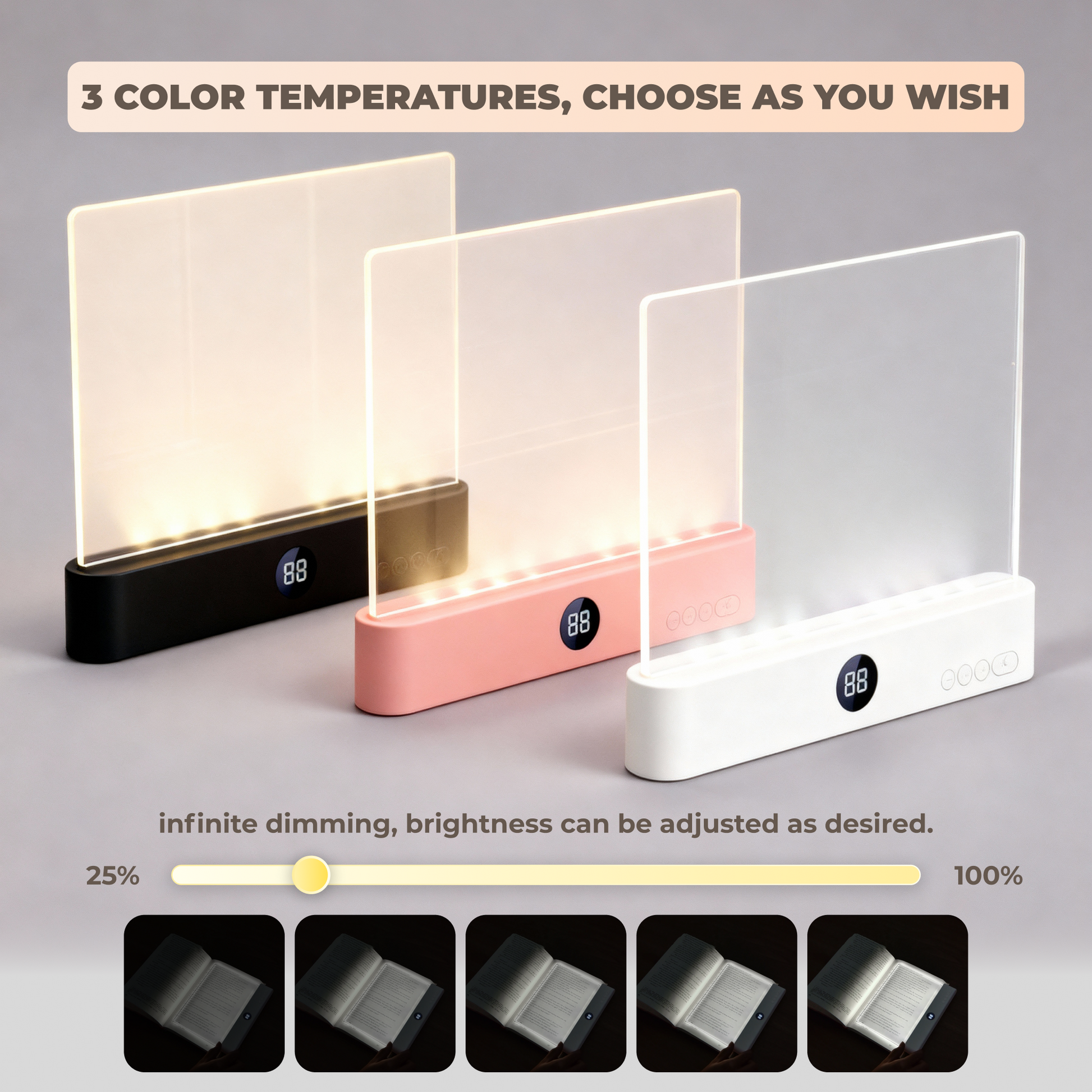 Turn the lamp on, select your desired brightness and color temperature (warm/cool). Position the panel so it casts even light across your pages or workspace.